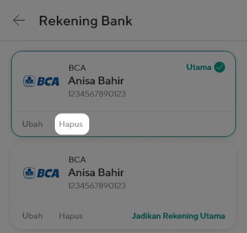 - Klik Hapus di daftar rekening bank yang ingin dihapus.
