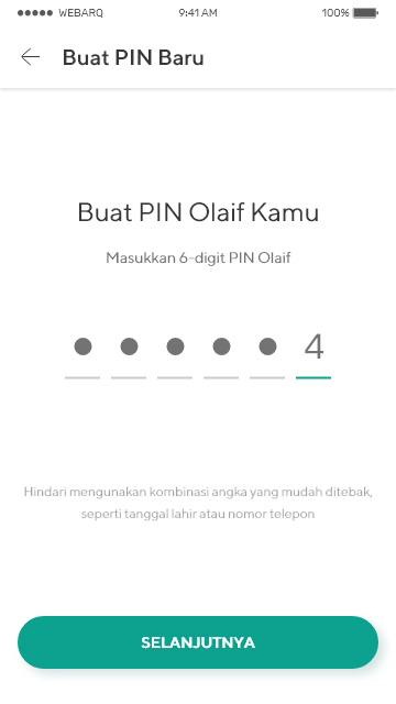 - Jika kamu belum pernah membuat PIN, masukkan 6-digit angka untuk dijadikan PIN Olaif, kemudian klik Selanjutnya.