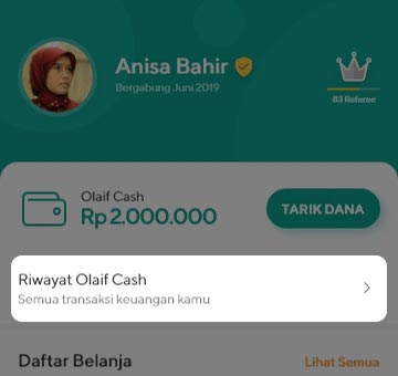 - Di bagian Olaif Cash, klik Riwayat Olaif Cash.