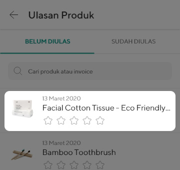 - Di menu tab Belum Diulas, pilih produk yang akan kamu berikan ulasan.