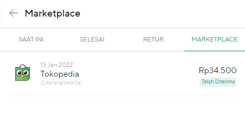 - Pembelanjaan di marketplace kamu akan mulai terhubung pada aplikasi hanya ketika status transaksi marketplace telah berubah menjadi “Telah diterima” dan proses pembelanjaan di marketplace kamu telah selesai.
