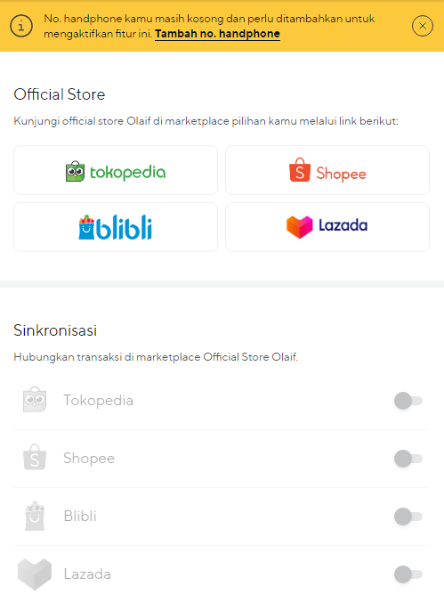 No. handphone kamu yang telah terdaftar pada Aplikasi Olaif akan terhubung dengan no. handphone di akun marketplace kamu. Pastikan no. handphone pada aplikasi Olaif kamu sama dengan no. handphone akun marketplace kamu.